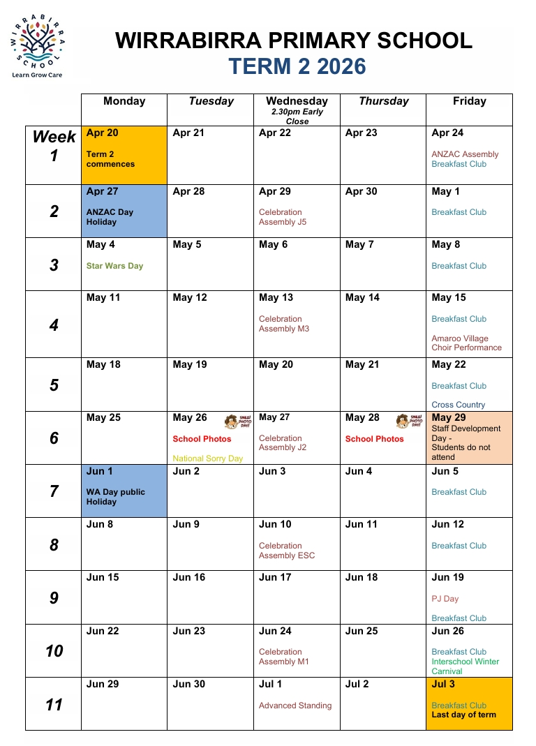 To keep parents informed of school activities, newsletters are emailed Thursday fortnightly. At the beginning of each term, a calendar is also emailed home for parent information. It can also be viewed here on the web site under the link 2021 Term 1 Planner. Any changes or new events will be listed in the newsletter.